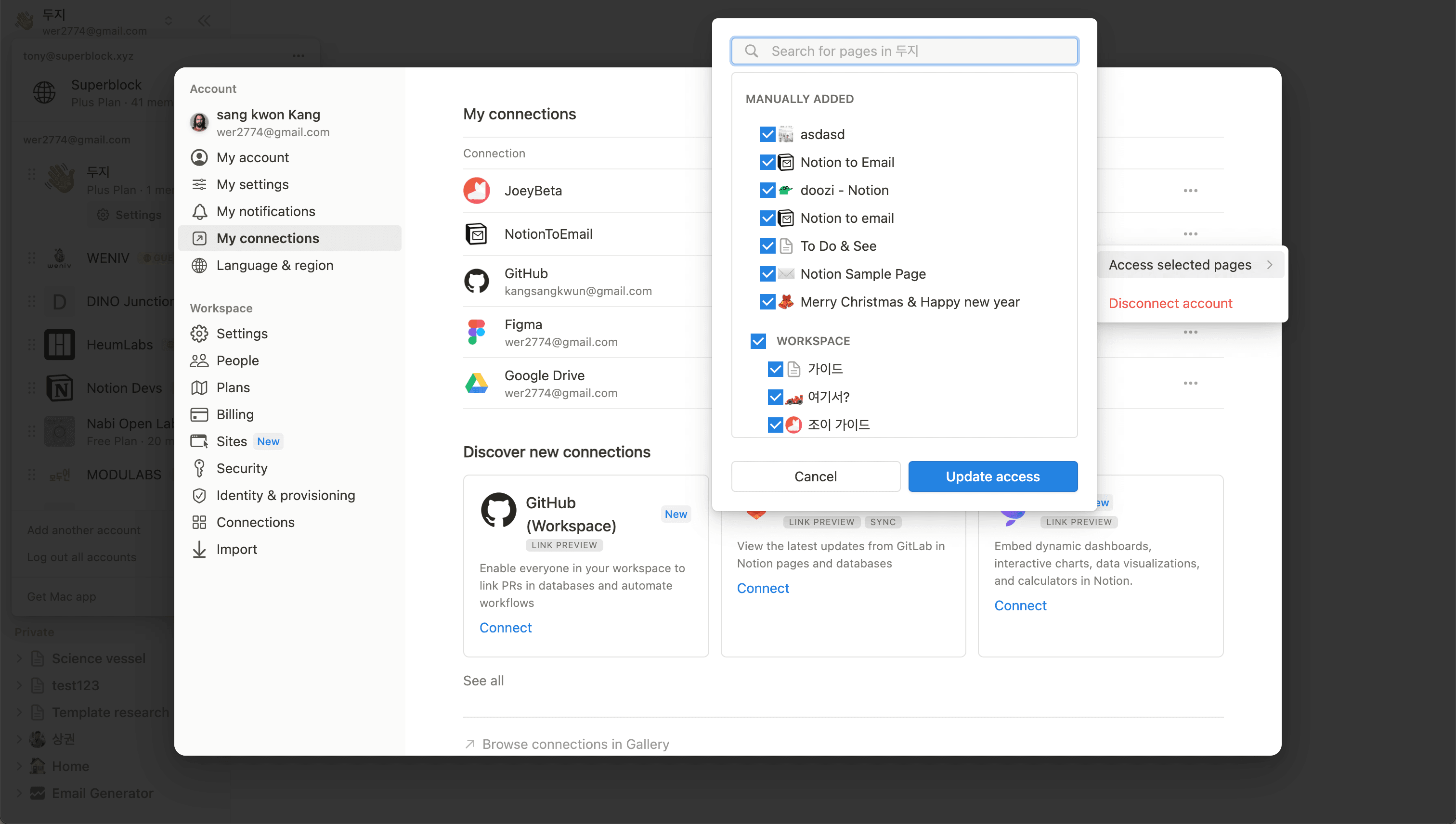 설정된 권한은 노션 설정 메뉴에서 My connections > to.email > Access selected pages에서 확인하실 수 있습니다.
